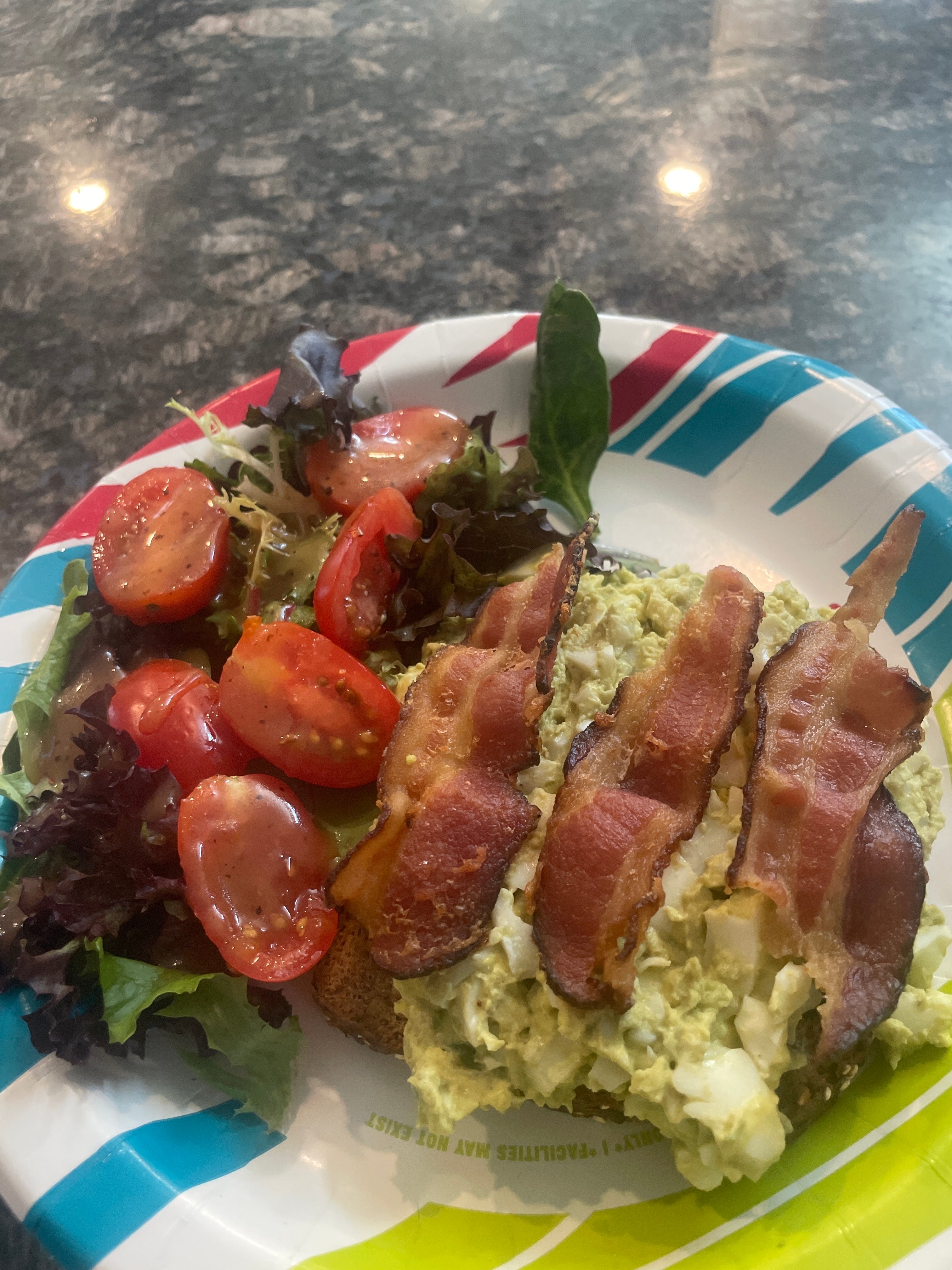 Good morning Queens!! Cheers to Greens! I woke up and started my day with 2 core workouts ( shoutout to Sami and Raven replays). Now I’m eating.. Egg Avocado Slad with greens and 2 slices of bacon on Dave killer bread.
