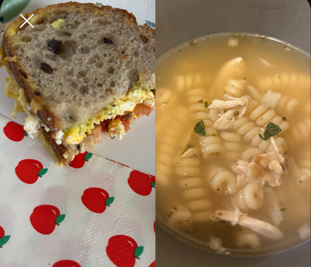 Today I ate the bread from my shopping cart items. An egg sandwich for breakfast, I have a love hate relationship with eggs but they do the job! Then a quick soup from items I found in my fridge. Tomorrow I’ll do a salad and fruit day.